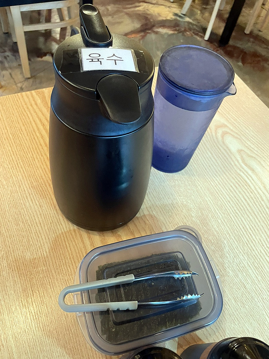 각 테이블에는 기본적으로 데리야끼 소스, 매운 데리야끼 소스, 김이 올려져 있습니다.