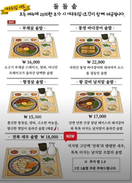 *돌돌솥은 '1인 1솥밥'을 원칙으로 하며, 부채살, 항정살, 왕갈비 솥밥에 대한 간략한 안내문이 부착되어 있었습니다.