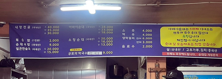대표 메뉴는 순대국밥, 아바이순대, '공포의 막국수'였습니다. 저희는 순대국밥을 주문했고, 아바이순대는 아쉽게도 품절이라 맛보지 못했습니다. 다음번 방문 시에는 매운맛 조절이 가능하다는 '공포의 막국수'를 꼭 시도해보고 싶네요.
